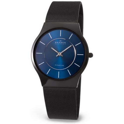 Cap off your wardrobe with the clean lines and sleek European styling of the Skagen 233LTMN. The thin and ultra light black tone titanium case frames a striking blue dial with silvertone hands and stick indicators. A black tone titanium plated stainless steel mesh band wraps the wrist for an attractive look and a comfortable feel. This Skagen watch offers reliable Japanese quartz movement and is rated water resistant to 30 meters.About Skagen